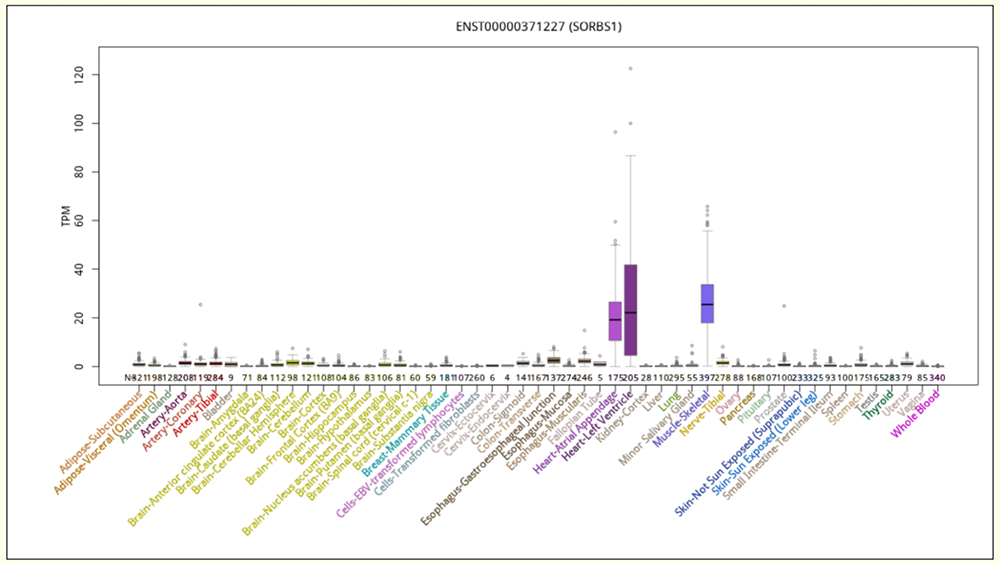 GTEx is a database that has five tracks on the Genome Browser that can be used to visualize tissue-specific isoform expression. Found in the "Expression" section are the tracks "GTEx Gene V8", "GTEx Gene", and "GTEx Transcript". The two former tracks both average gene expression in cell types from all of the gene's isoforms, shown in Figure 2 ("V8" has an additional tissue type). However, "GTEx Transcript" shows cell-type gene expression for each individual isoform. Since the "GTEx Transcript" track isolates splice variant expression, let's choose two isoforms from SORBS1 and compare their tissue-specific gene expression.