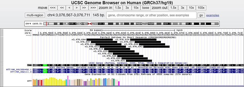 In Figure 1, we see the CAG repeats in the "Perfect Matches" track. In this particular window for this particular chromosome, there are 21 consecutive glutamine codons in the reference assembly. We know through studies that repeats within this gene of 26 glutamines or fewer are "normal" and will not result in Huntington's Disease. Repeats within the range of 27-35 fall within the "intermediate" category, where the patient is not at risk of developing symptoms of HD, but can conceive offspring within the HD-causing range. "Reduced Penetrance" are patients with 36-39 repeats. In this range, the patient may or may not go on to develop symptoms of HD, however, their children are at high risk of having HD. Finally, the last category, "Affected", applies to patients with 40 or more repeats. In this scenario, the patient will develop symptoms of HD throughout the course of their life. The more repeats present, the earlier the onset of symptoms. Currently, the exact reason why glutamine repeats cause this disease remains unknown. However, some scientists and studies speculate "instability" within the DNA structure as a possible cause.