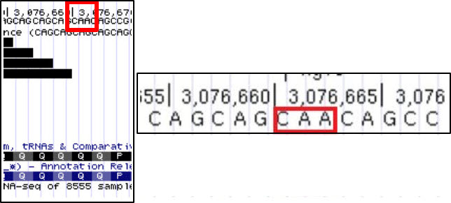 Figure 4. Zoom in on the CAG repeat sequence within the HTT gene, showing a particular section of the CAG nucleotide sequence. In the middle of the close-up, we can see a CAA codon.